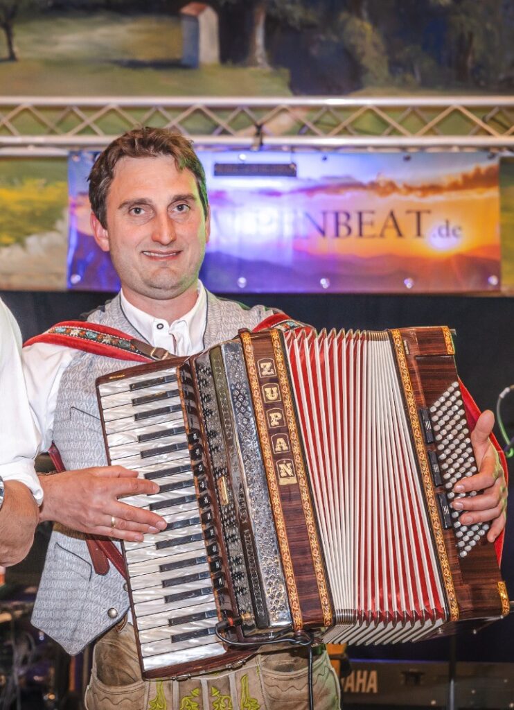 Alpenbeat Hans ist der musikalische Mittelpunkt von ALPENBEAT. Als Akkordeon- und Keyboard Spieler hat man diese Aufgabe von Natur aus – schließlich kann der gelernte Werkzeugmacher im Gegensatz zu den Bläsern gleich mehrere Töne auf einmal spielen. Hans spielte unter anderem viele Jahre bei den Erlbachern.